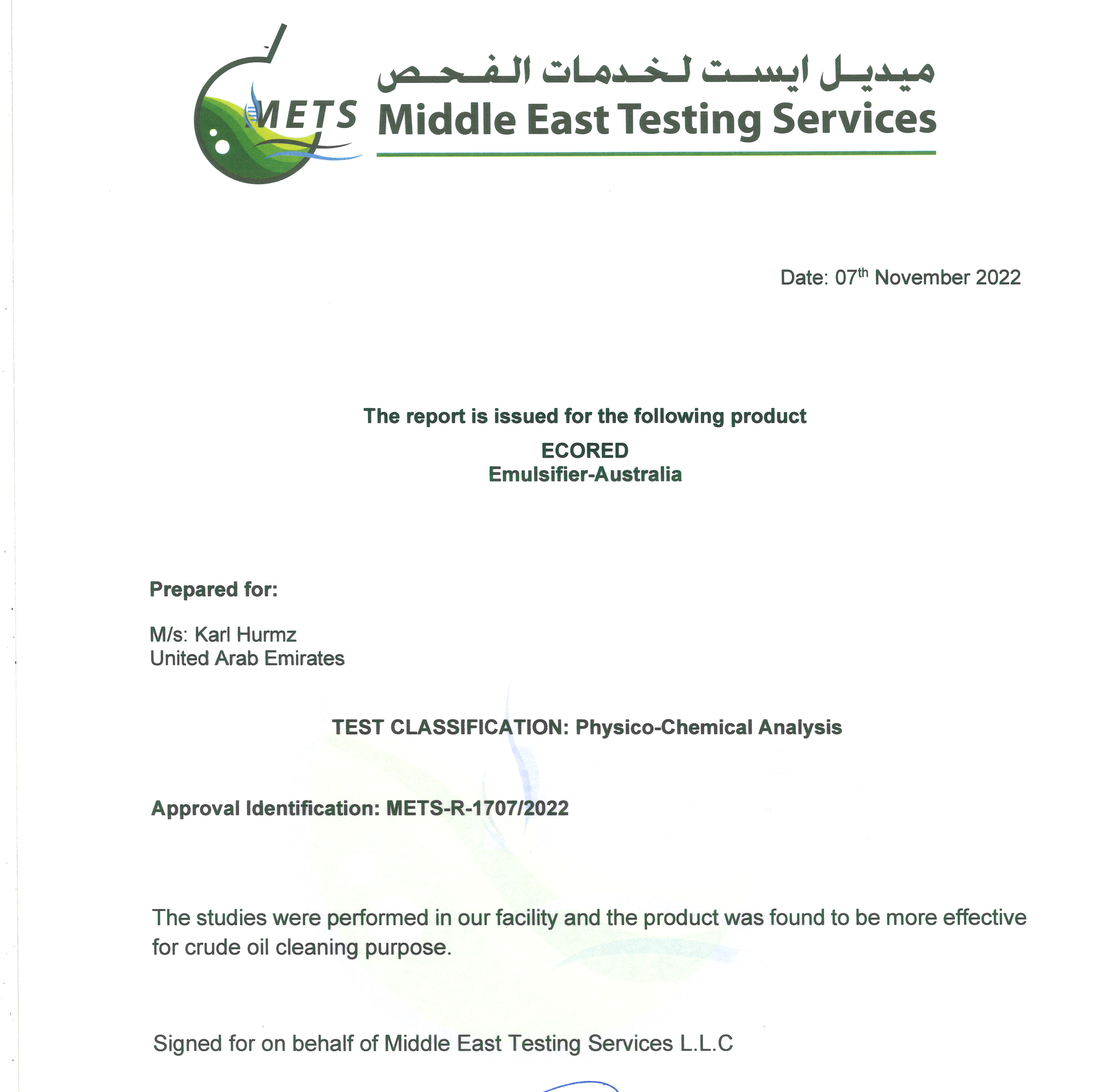 UAE -Tested and recommended as most effective on crude oil by “GEOSCIENCE TESTING LABORATORY.”