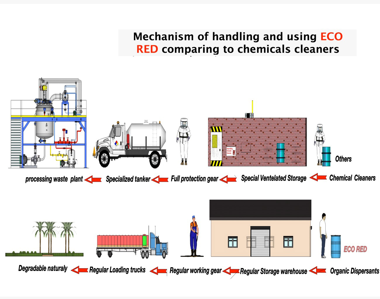Eco Red is useful for cleaning and processing of all types of oil spills and their derivatives, in all places and circumstances without affecting the physical and biological environment
