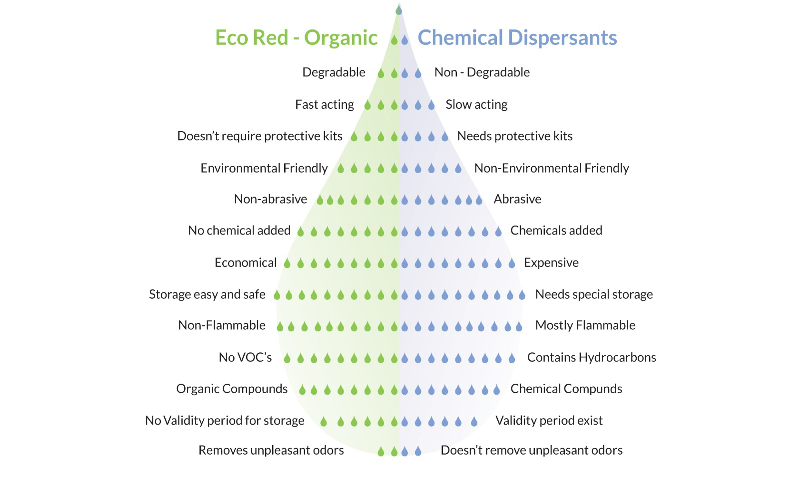 Eco Red disperses and removes harmful oil slicks from the environment by reducing surface tension with surfactants. These surfactants contain micelles, which are spread throughout the solution and attract oil drops from their surroundings. This drags the oil drops externally, breaking their molecules continuously. Being associated natural components leads to speedier and more effective results. This method disperses oil slicks into micro-drops that can be biodegraded and disposed of naturally. Dispersed drops become more solid with time, preventing them from being re-collected and placed in the mixture.